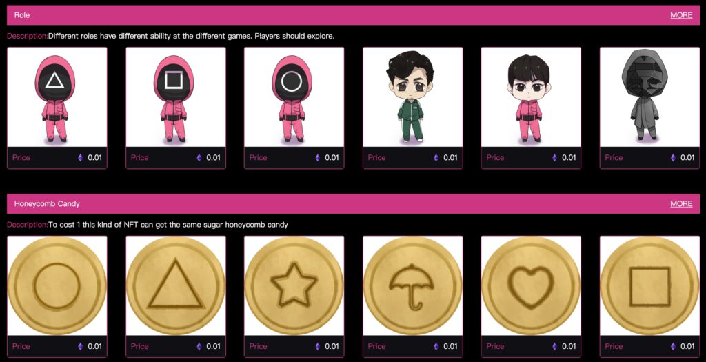 官方提供了遊戲化角色的 NFT,例如:穿著全身紅粉色西裝的警衛和Q版男女主角。