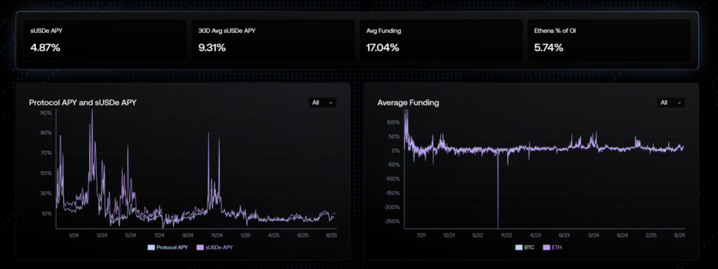 其中前者比較穩定,目前大約在 4% 附近浮動,而後者則完全取決於市場情緒,因此 USDe 的年化收益某種程度上也直接取決於全網資金費率(市場情緒)。