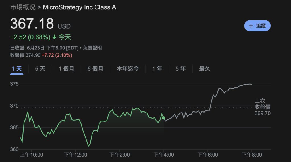 據 Google 財經數據顯示,股價收盤報 367.18 美元小幅下跌,此次購買比特幣並未對其股價帶來顯著影響,不過盤後在川普宣布伊以停火消息之後有所上漲。