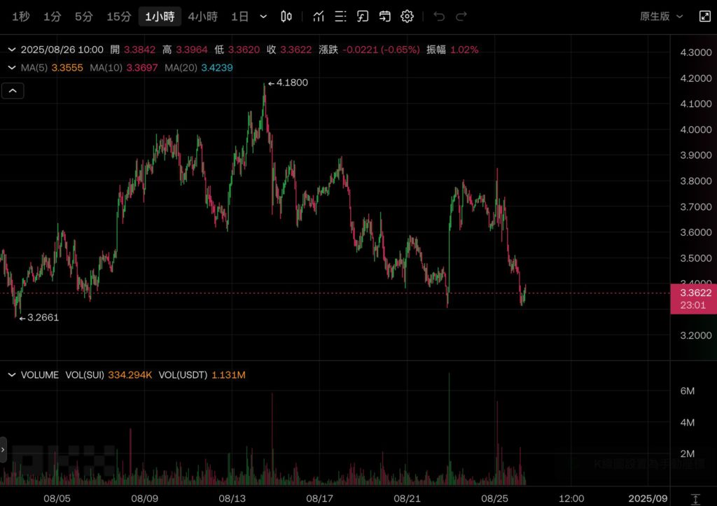 在加密貨幣市場普遍回調下,SUI 過去 24 小時下跌超 9%,截稿前現報 3.36 美元。SUI Group 改名事件會帶來多少潛在推力,還有待時間觀察。