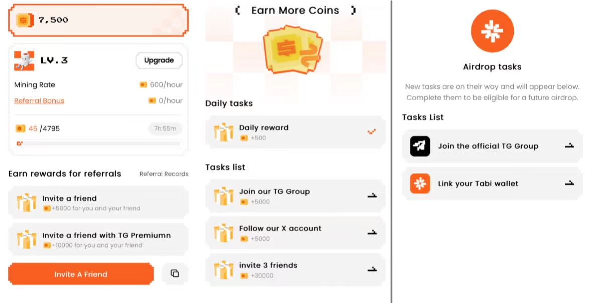 經動區實測,目前進入 Tabi TG 小程式,通過關注其官方媒體帳號、邀請朋友一起遊玩等方式,就能領取相應遊戲內代幣(或許與未來空投有關),其遊戲玩法也簡單,就是不斷升級等級,提高挖礦效率。