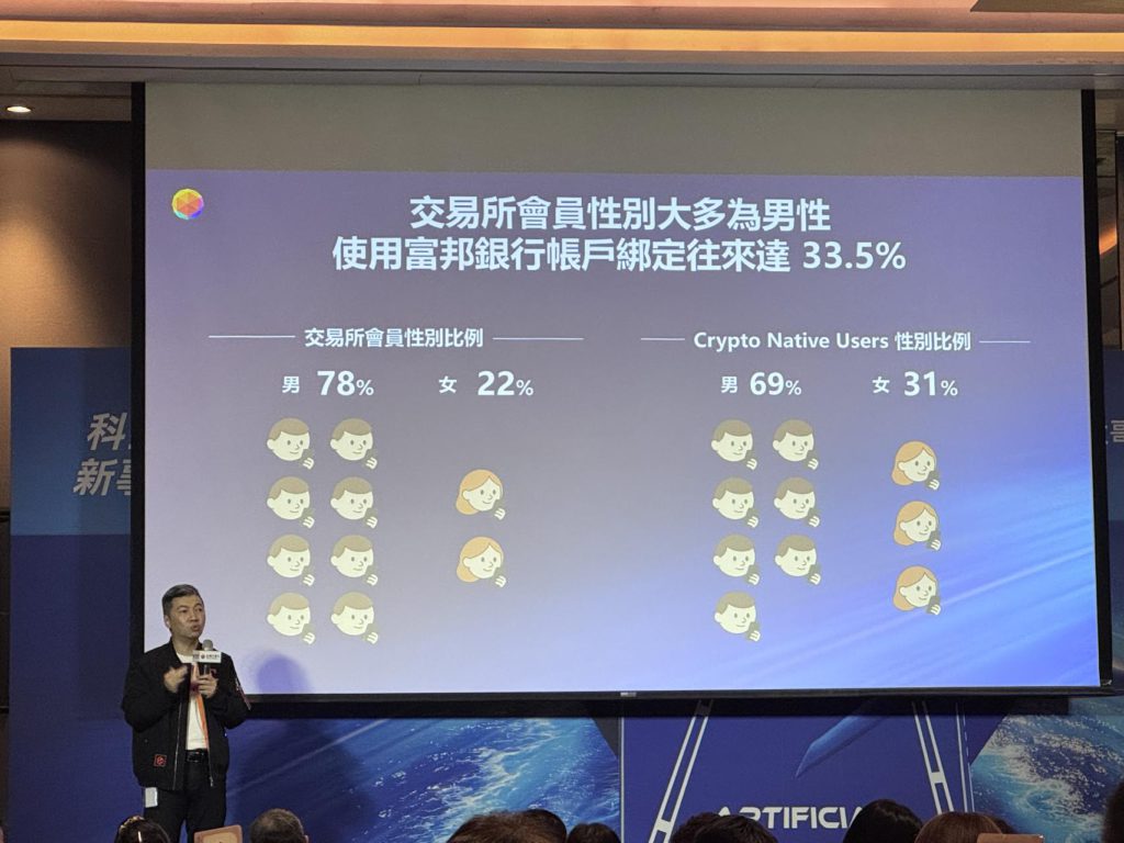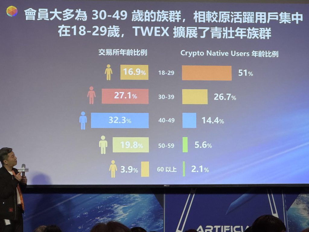 Web3 事業副總暨富昇數位總經理韓昆舉也表示,自5/22上市後,旗下TWEX虛擬資產交易所成績也十分斐然,在演講過程中,更是舉出各年齡層、性別、及比特幣、以太坊族群的差別。