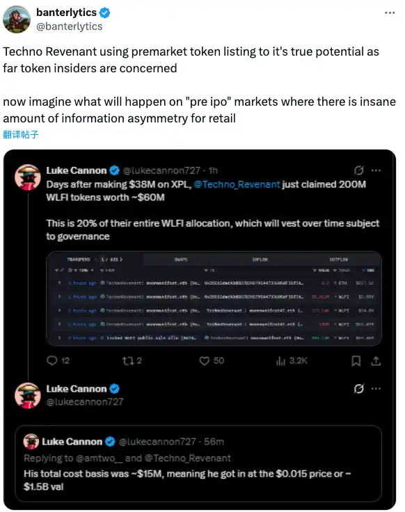 這也進一步引發了社群對近期火熱的鏈上股權 (Pre IPO) 模式的擔憂。KOL banterlytics 在 X 上表示,「看到了 TechnoRevenant 在代幣的 Premarket 上已經產生了如此大的影響,想像如果發生在擁有更多內線消息的 Pre IPO 上會如何」