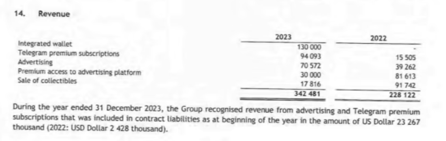 在 Telegram 的總收入中(3.42 億美元),我們可以看到: