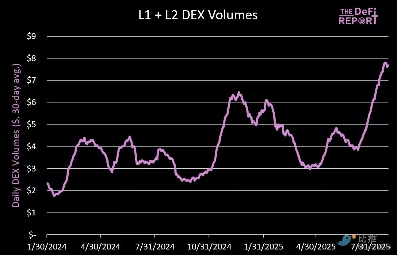 平均每日 DEX 交易量較 4 月低點上漲了 266%,其中 L1 (第一層) 主網貢獻了約 67% 的交易量。