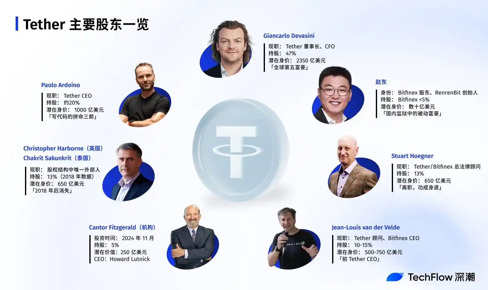 不到 10 個人掌控著 Tethter 1,700 億美元穩定幣帝國的絕大部分股權。其中,僅 Giancarlo Devasini 一人就持有 47%;而剩下的大人物們,甚至大多數都不在加密行業的聚光燈下。