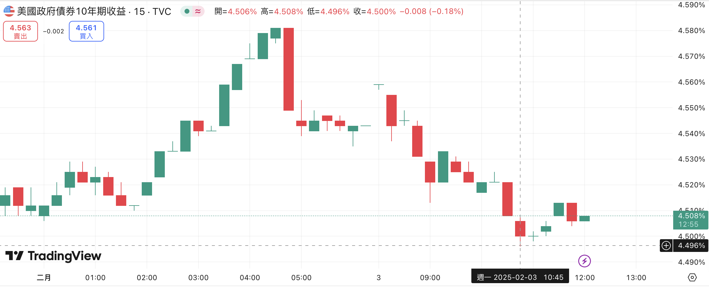 然而今日市場情緒急劇轉變,10 年期美債殖利率一度急跌至 4.496%,較 1 月 31 日收盤暴跌 8.4 個基點,顯示投資人避險需求驟增。