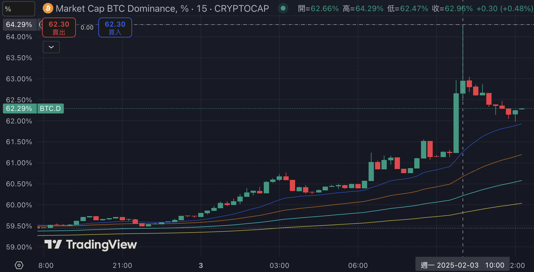 在山寨幣普遍遭到拋售的情況下,比特幣市值佔比(BTC.D)攀升至 64.29%,創下自 2021 年 2 月以來的新高。截稿前暫報 62.29%,過去 24 小時內上漲 2.66%。