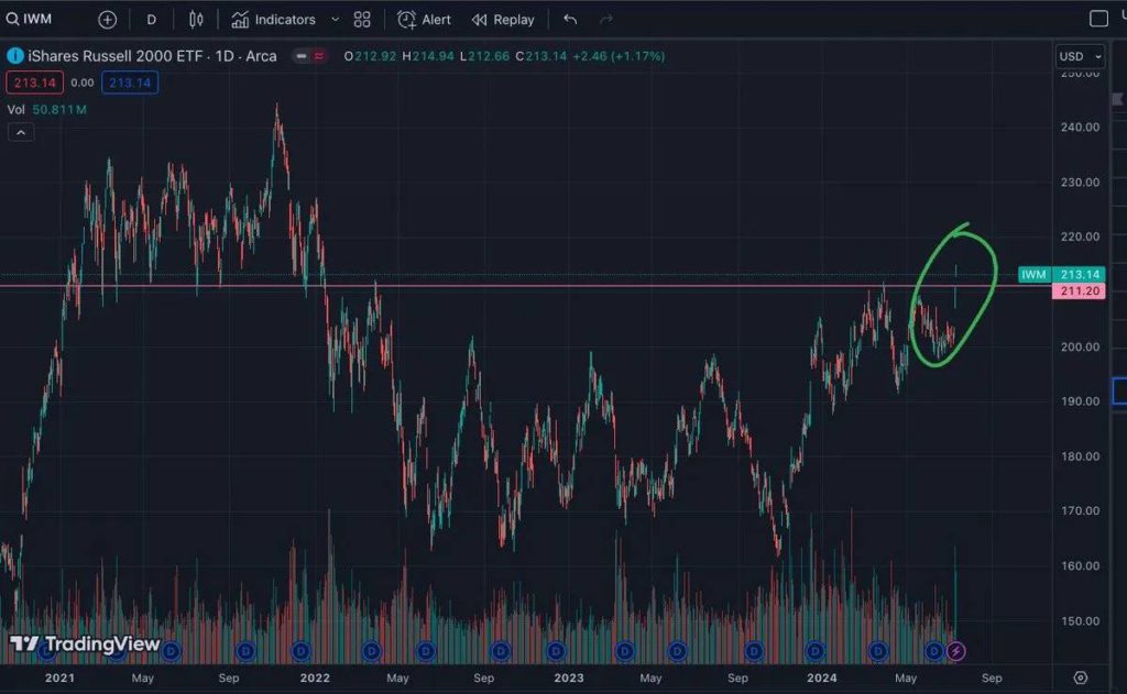 洞察: $IWM 代表小盤股,近期開始突破。這一指數是衡量實體經濟健康狀況的重要指標。隨著企業收益增加,更多資金通常會流入這些資產。