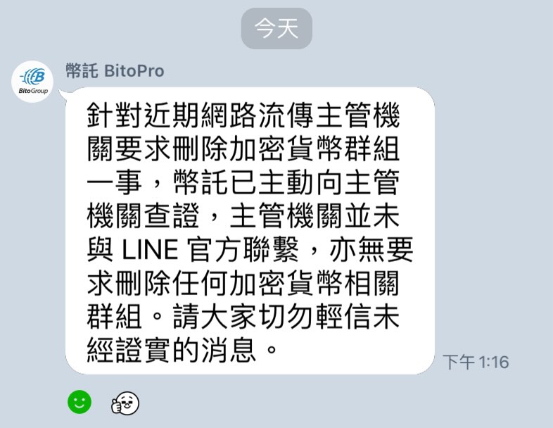 針對近期網路流傳主管機關要求刪除加密貨幣群組一事,幣託已主動向主管機關查證,主管機關並未與 LINE官方聯繫,亦無要求刪除任何加密貨幣相關群組。請大家切勿輕信未經證實的消息。