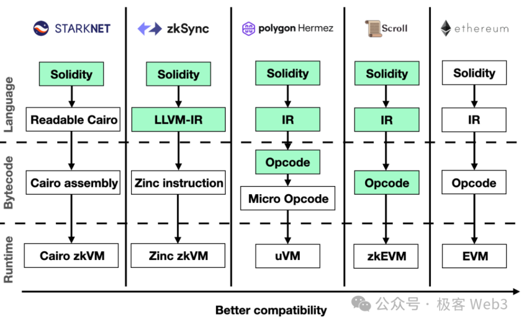 反之,zkVM 是自己定義了一套指令集 / 操作碼,它自定義的指令集可以做的很簡單,可以很 ZK friendly,你做出來一套 zkVM 後,不必頻繁的更改底層程式碼,就能支援各種升級和預編譯。所以 zkVM 的主要工作量和後續升級維護的難度,就放在了編譯器也就是把智慧合約轉化為 zkVM 操作碼的那一步,這和 zkEVM 有很大不同。