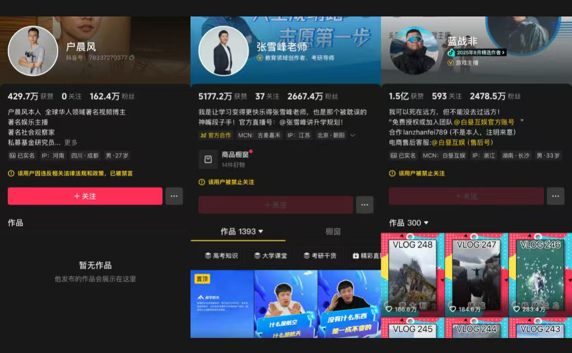 近期,中國大陸社交媒體掀起了一陣「封禁潮」,三位擁有數百萬甚至數千萬粉絲的知名網紅:戶晨風、藍戰非、張雪峰,相繼遭遇「三連封」,他們在微博、抖音、B 站、小紅書、快手等中國主流社交平台的帳號均遭到來自官方不同程度的限制,包括禁止新用戶關注、清空創作內容、禁止直播和限制流量。