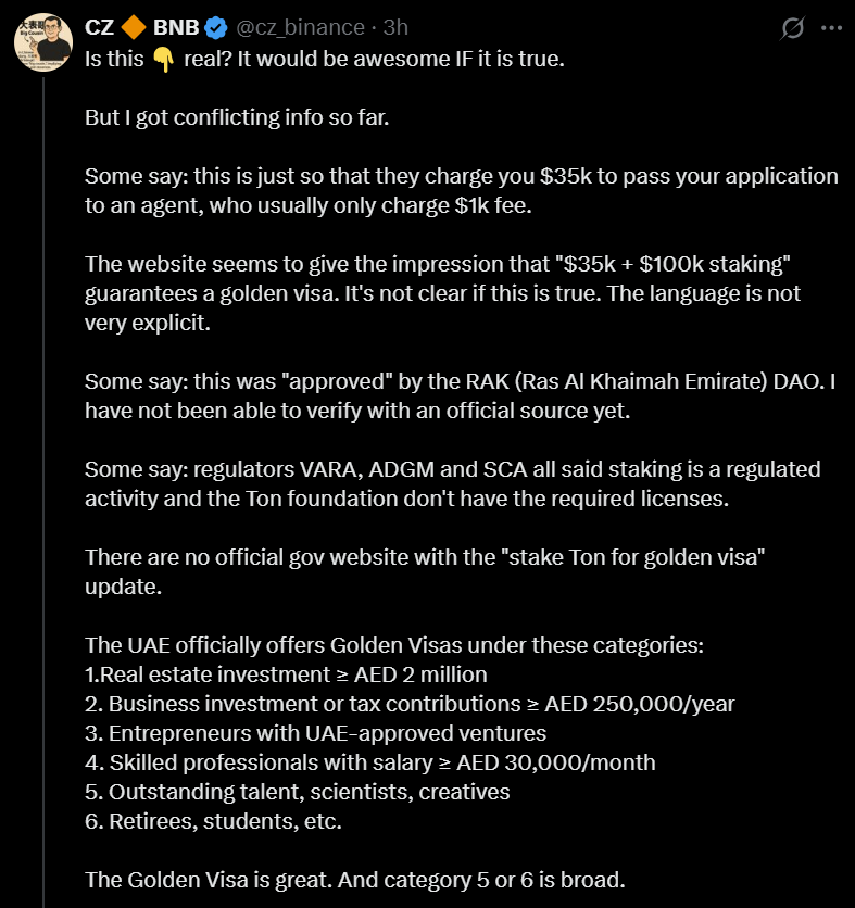 TON Foundation is aware of the premature announcement that circulated on X regarding a UAE Golden Visa initiative offered by TON. We apologize for any confusion it may have caused.