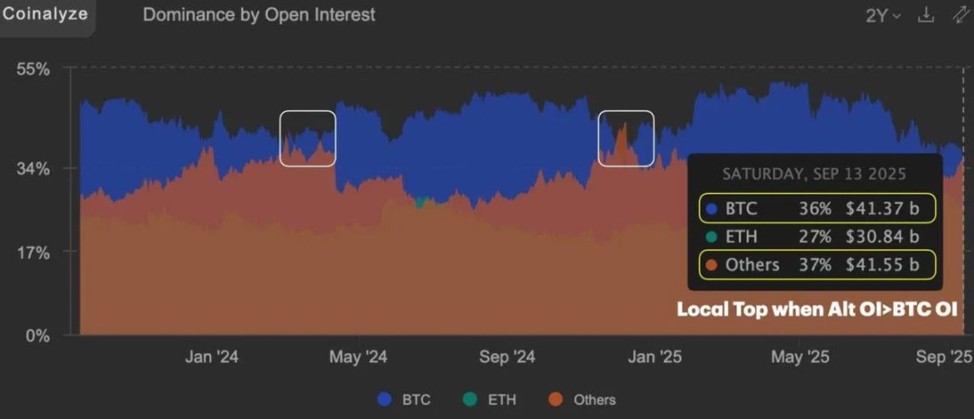 自去年 12 月以來,另類投資(除比特幣以外的加密貨幣)的未平倉合約量首次超過比特幣;而歷史上最後兩次出現這一現象時,市場均恰好迎來了局部頂部。