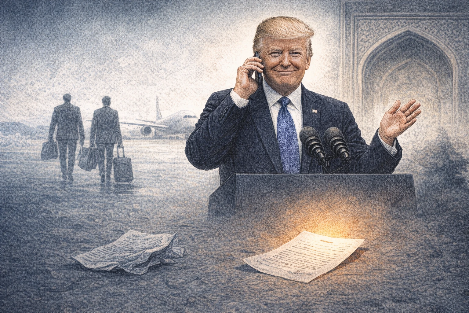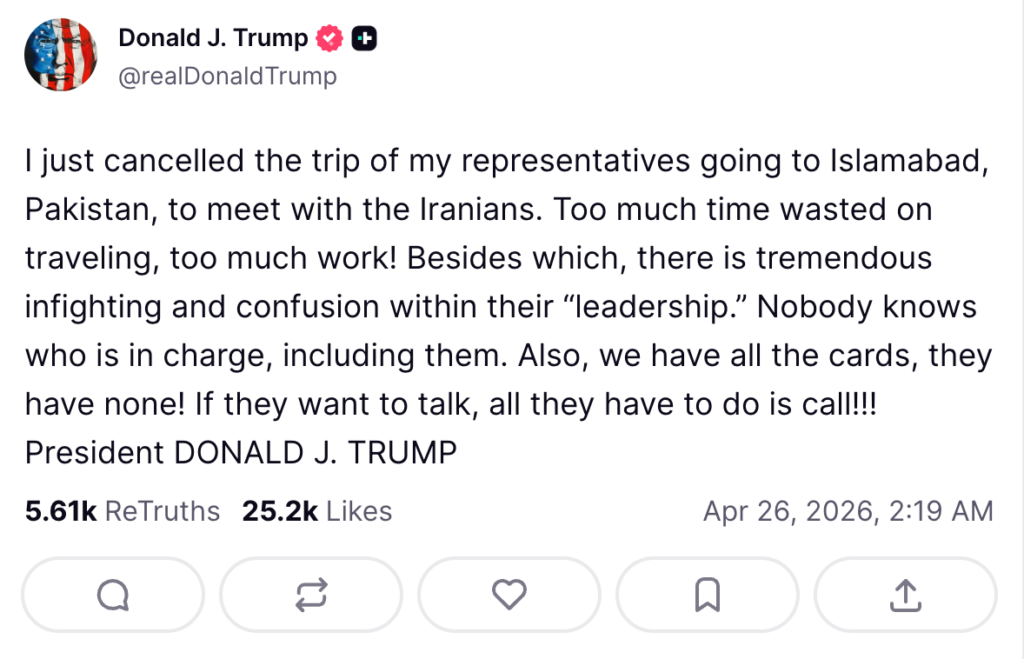 然而就在出發前夕,川普以伊朗內部局勢「混亂」為由,在 Truth Social 上宣告取消,他表示籌碼在美方手上,沒有必要急著坐下來。