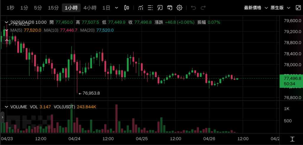 在美伊談判未有好消息的背景下,比特幣兩日來持續在 7.7~7.8 萬美元之間窄幅震盪,沒有太大的波動。