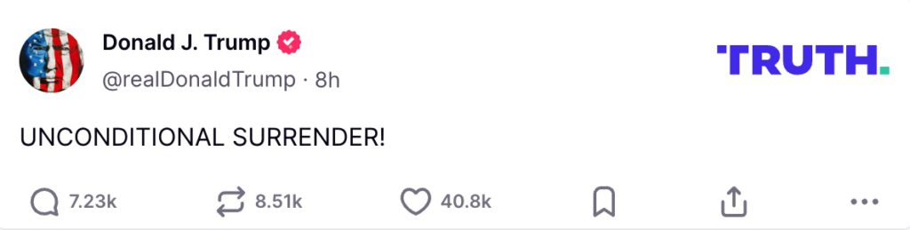 為出席此次會議,川普提前離開義大利 G7 峰會,並在空軍一號上告訴記者,他對「停火」毫無興趣,目標是「徹底終結」戰爭與伊朗核計畫。今日午夜他還在 Truth Social 連發貼文,聲稱美方對伊朗領空擁有「完全和全面控制權」,並警告哈梅內伊勿攻擊美軍,甚至貼出「無條件投降」字樣。