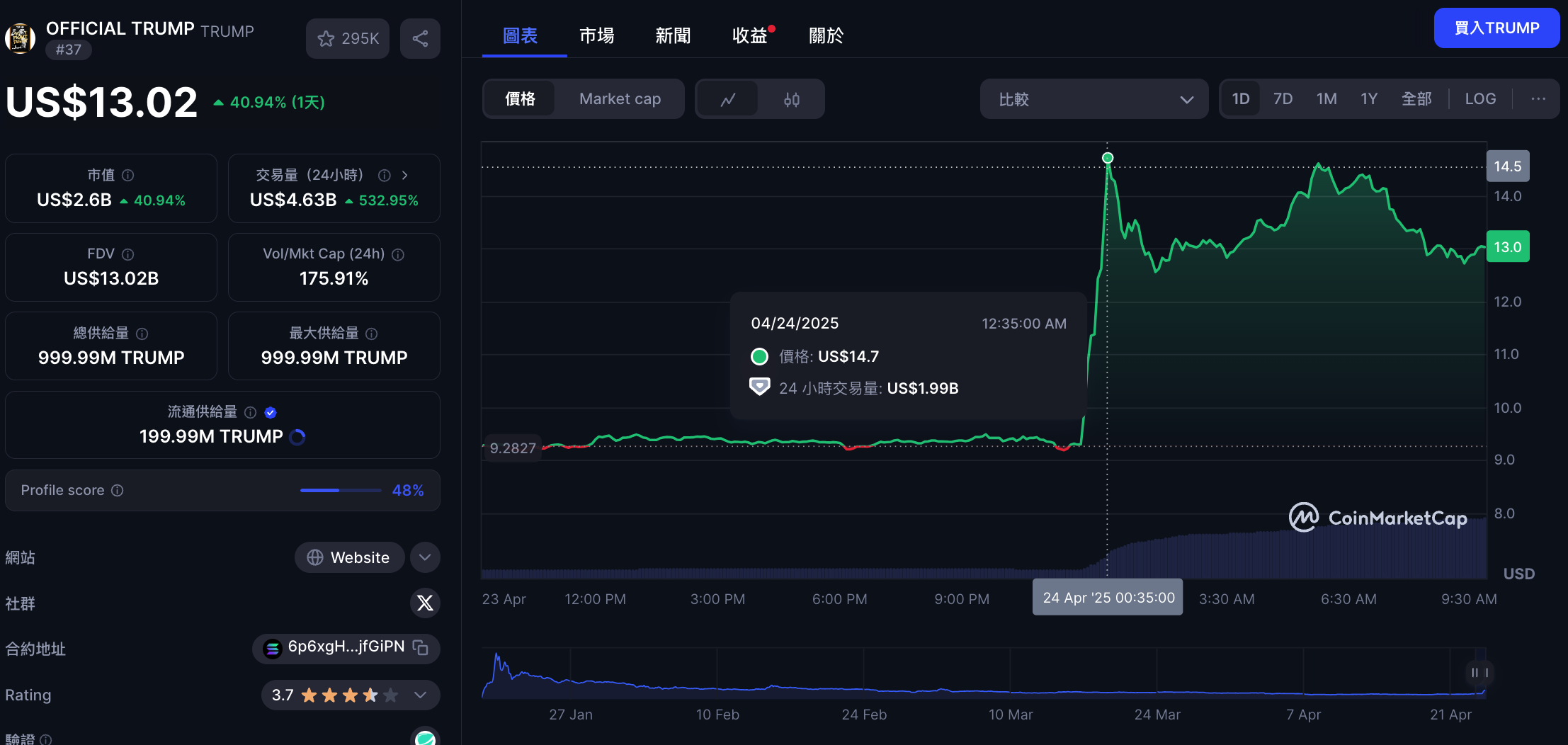 消息一出後,川普$TRUMP立即引發暴漲,甚至一度觸及60%漲幅,儘管與首發價格相去有段距離,但還是讓人看到美國總統的政治影響力。