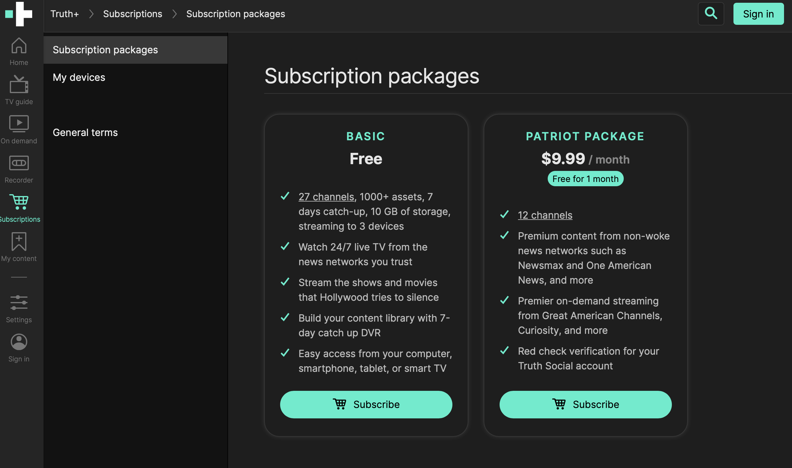 Truth Social 的串流平台用戶每月支付 9.99 美元,可收看 12 個「非覺醒」新聞頻道、專屬影音與紅色驗證勾勾。