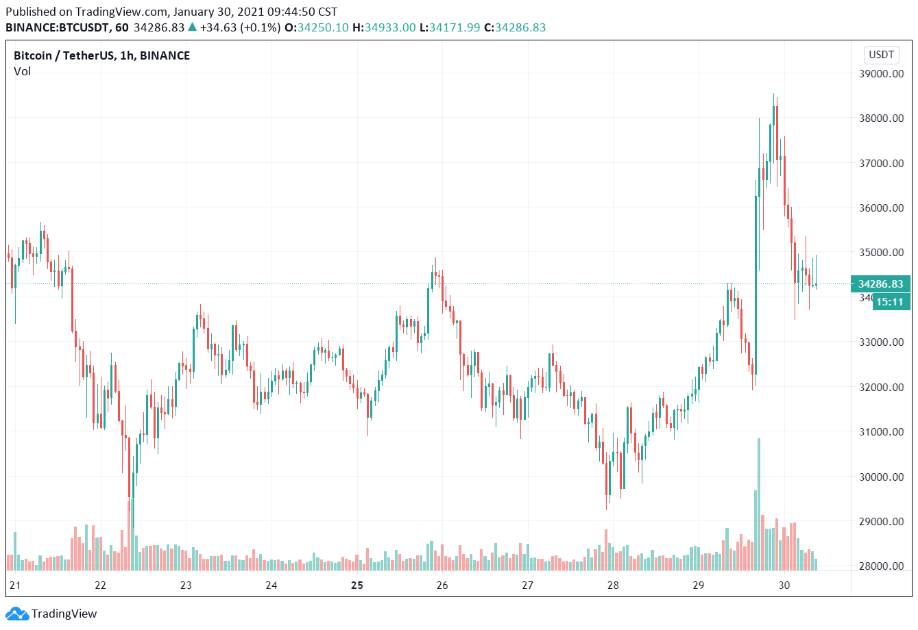 根據 Trading View 數據,比特幣(BTC)價格本月 8 日寫下歷史新高點 41,950 美元後,便進入回調。昨日因全球首富馬斯克(Elon Musk)將社群平台推特(Twitter)的自介改為「#Bitcoin」,引爆一段漲幅,自最低 32,006 美元上漲至最高 38,532 美元,漲超 20%。然目前又有所下修,至截稿前報價 34,286 美元。