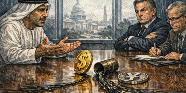 阿聯央行行長 Khaled Mohamed Balama 在 IMF 春季會議期間,親赴華府向美國財政部長 Scott Bessent 與聯準會官員提議建立貨幣互換機制,目的是確保迪拉姆匯率穩定。關鍵籌碼浮上檯面:若美元供應緊張,阿聯可能被迫改以人民幣結算石油出口,動搖石油美元體系的核心支柱。