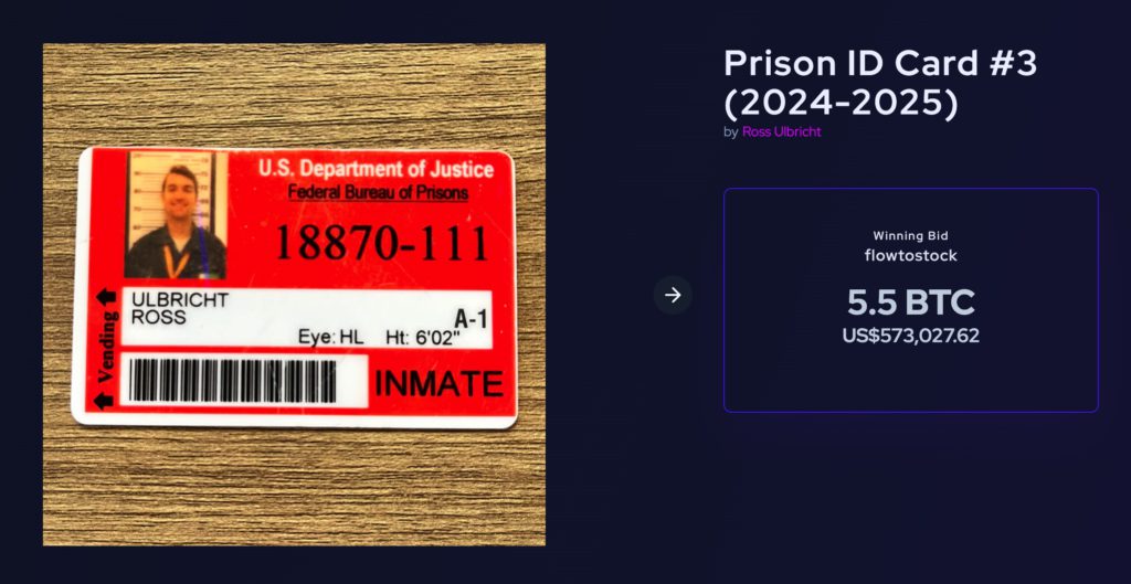 Ulbricht 的預想是對的,有多項拍品引起市場關注。其中,Ulbricht 的最後一張獄中 ID 卡以 5.5 枚 BTC (約合 57 萬美元) 的高價售出。Ulbricht 對此表示: