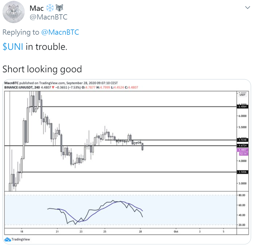 該匿名分析師昨日(9 月 28 日)於推特上指出,UNI 目前的交易價格低於其提及的 4.67 美元關鍵水平,而持續跌破 4.65 美元將可能導致續跌、若突破 5.1 美元則後續看漲: