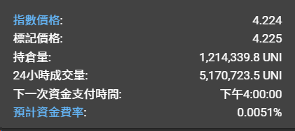 根據幣安及 FTX 的資料顯示,目前 UNI 永續合約資金費率為正值,意即目前做多 UNI 的人較空軍為多、做多 UNI 的人將要為其持倉部位付費;不過其資金費率與發幣之初相比,整整少了 90% 上,市場嚴重偏向任何一方的情況已不復見,目前的數值也已恢復到正常的資金費率水平。