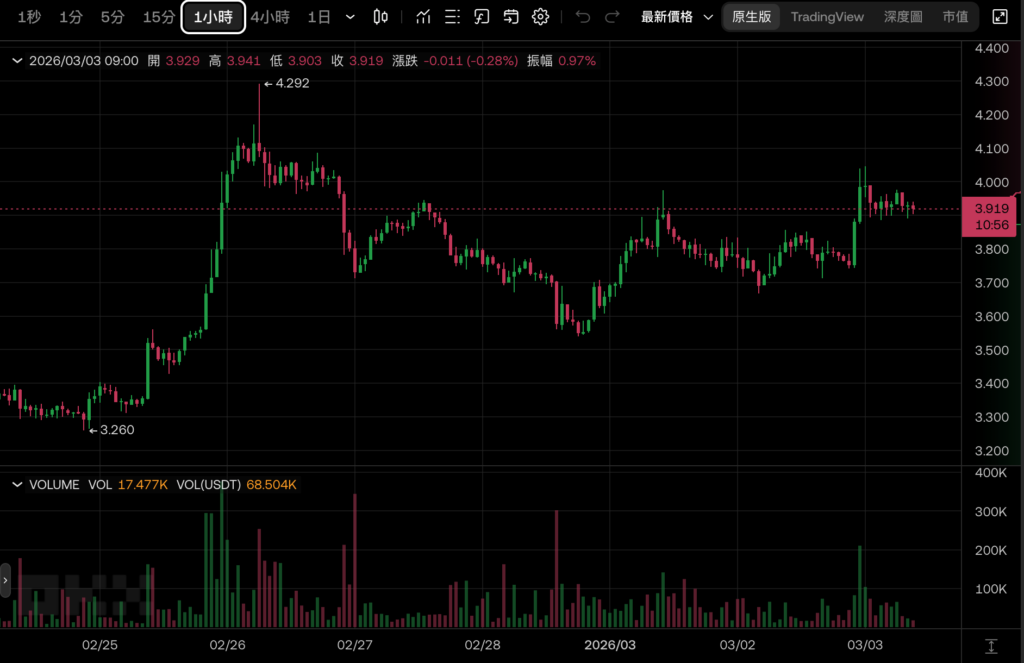 而幣價方面,UNI 代幣近日基本上還是跟隨比特幣為主,昨晚一度突破 4 美元;截稿前暫報 3.9 美元,近 24 小時漲幅 2.7%。
