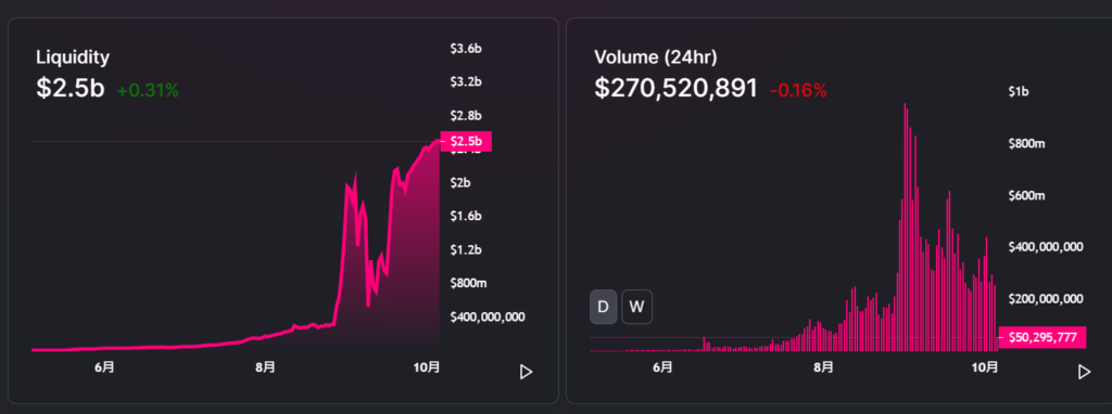 然而,雖然 Uniswap 在 9 月份的交易量交出漂亮的成績,且 10 月開始至今 Uniswap 的流動性仍持續增加當中,但根據其官網,在日交易量部分,自從 9 月 17 日達到區間高點之後,交易量目前正在逐步下降:與 9 月 1 日單日交易量的高點 9.5 億美元相比,10 月 5 日單日交易量僅為 2.5 億美元,萎縮近 74%。