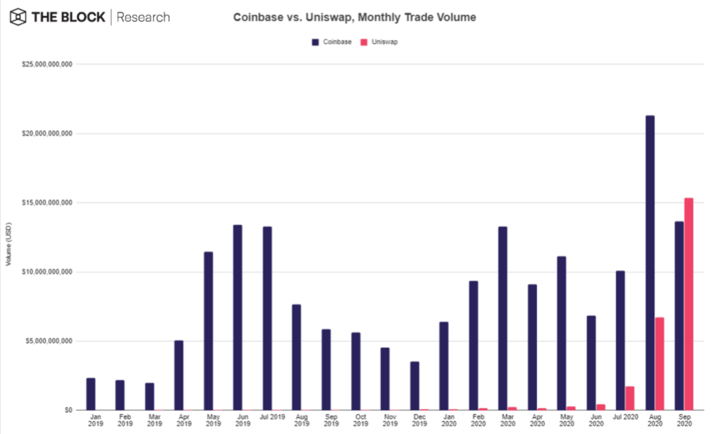 這一手傑出的操作使 Uniswap 重回 Defi 總鎖倉量的寶座,且據 The Block Research 市場數據報告顯示,Uniswap 於 9 月的交易量首次超過了加密貨幣交易所 Coinbase 的當月交易量:9 月份,Uniswap 的交易量約為 154 億美元,佔該月去中心化交易所(DEX)的總交易額-235 億美元中的 65%;而相比之下, Coinbase 的 9 月交易量僅為 136 億美元。