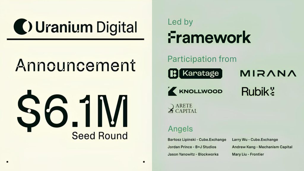 在這一背景下,Uranium Digital 以區塊鏈技術為核心,致力於構建全球首個 24/7 全天候、合規、機構級的鈾現貨交易市場,讓鈾具備與其他大宗商品相同的金融交易基礎設施。Uranium Digital 的理念也迅速得到了風投機構的支援 —— 去年 12 月,Uranium Digital 完成 170 萬美元 Pre-Seed 輪融資,Portal Ventures 領投、Framework Ventures 和 Karatage、以及多個天使投資人蔘投;今年 3 月,Uranium Digital 宣佈已籌集 610 萬美元種子輪資金,Framework Ventures 領投。