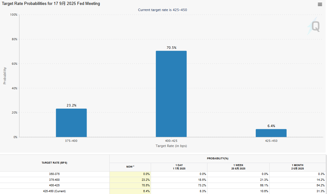 而對於市場討論的降息問題,ADP 數據公布後,期貨市場顯示,交易員預計今年仍會出現 2 次降息。同時據芝商所 FedWatch 工具顯示,目前市場預計 7 月聯準會維持利率不變的機率為 75.7%,較 ADP 報告發佈前有所下降;市場認為 9 月降息 1 碼的機率,則為 70.5%。