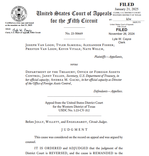 實際上這項結果目前看來並不令人意外,因為在去年 11 月底,美國第五巡迴上訴法院的三名法官小組就曾裁定,OFAC 在制裁 Tornado Cash 的不可變智能合約(提供隱私功能的程式碼)方面越權,因為它們不是外國人或實體的「財產」。