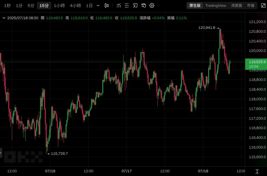 市場普遍解讀,法案落地將提升產業透明度與合規性,同時吸引更多機構資金進場,比特幣也受到激勵,價格在今(18)晨約五點再度突破 12 萬美元,最高觸及 120,941 美元,較當天低點反彈近 3%。