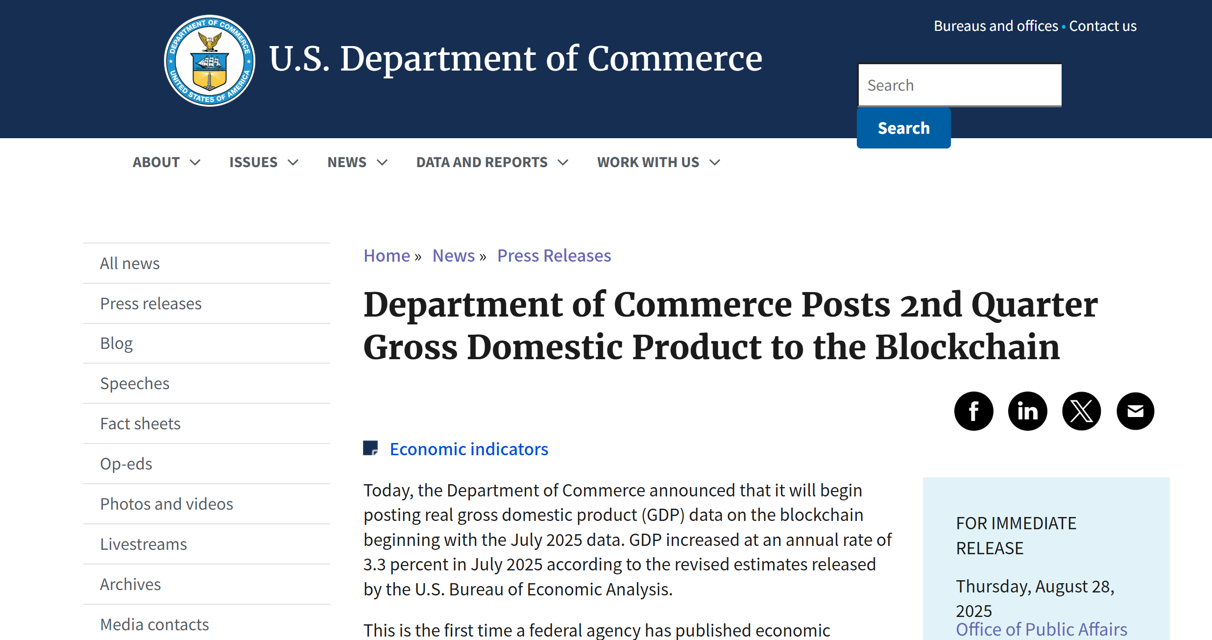 美國商務部長:將把 GDP 等核心經濟數據「放上區塊鏈」