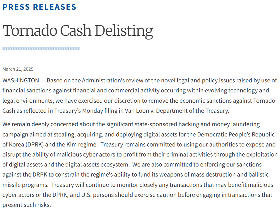 根據政府審查,我們已行使我們的裁量權,決定解除對 Tornado Cash 的經濟制裁,這一點反映在財政部週一在「Van Loon 訴財政部」案件中提交的文件中。