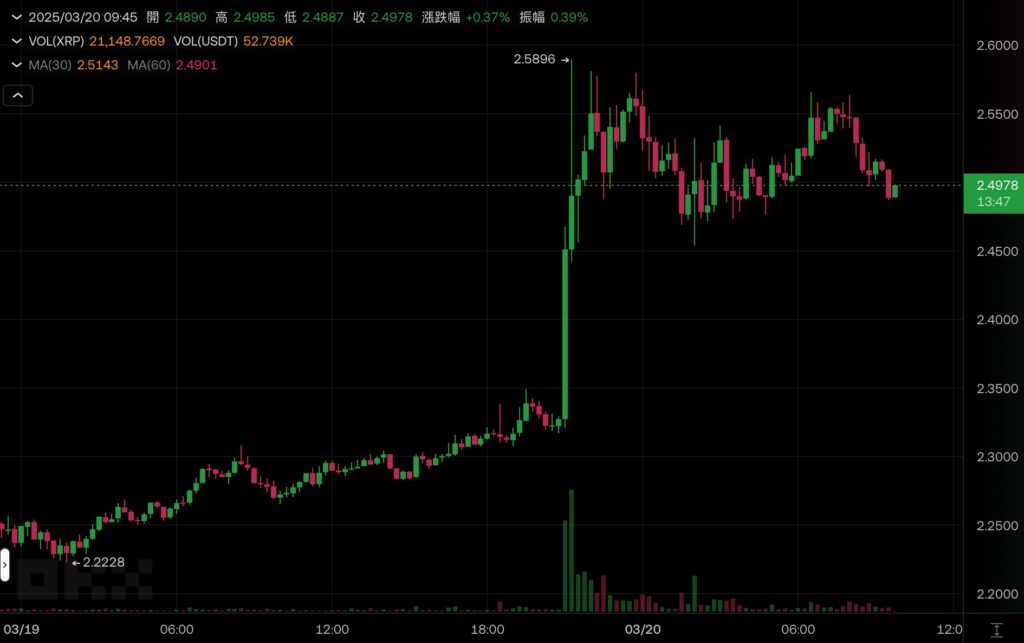 受此消息激勵,瑞波幣 XRP 在其 CEO 發佈公告後就迅速上漲,半小時內一度衝上 2.58 美元,撰稿當下稍有回落至 2.49 美元,但其近 24 小時漲幅逼近 10%。