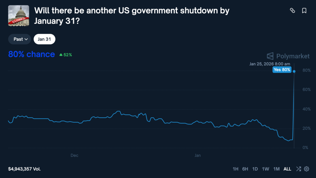 目前根據 Polymarket 數據,市場押注美國政府會在 1 月 31 日再次停擺的機率達 80%。