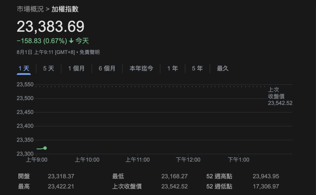 消息公布後,台股早盤下跌 158 點(0.67%),未來是否能透過談判持續降低,將決定台美貿易新格局。