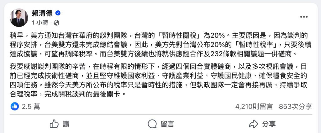 • 總統賴清德:20% 為暫時性稅率,談判仍在進行