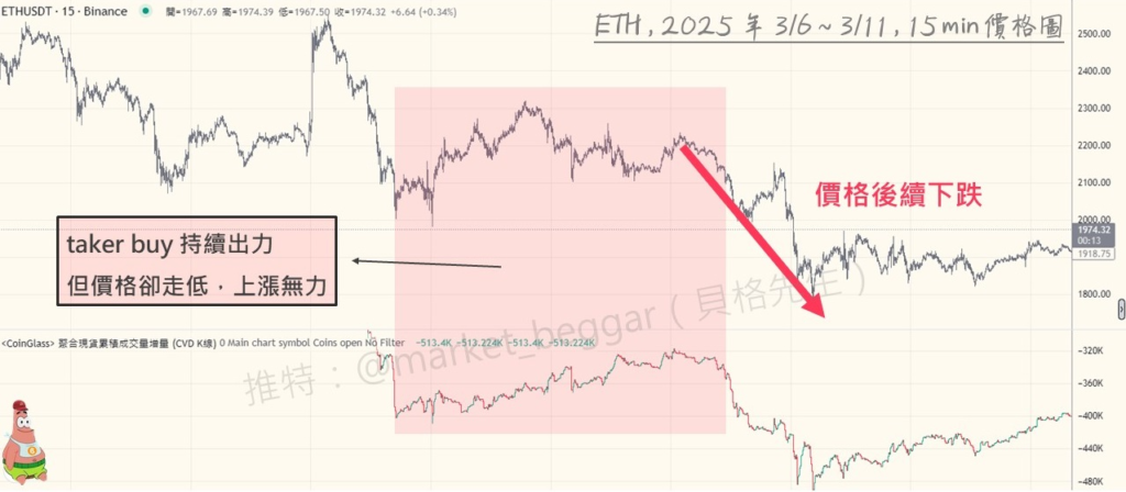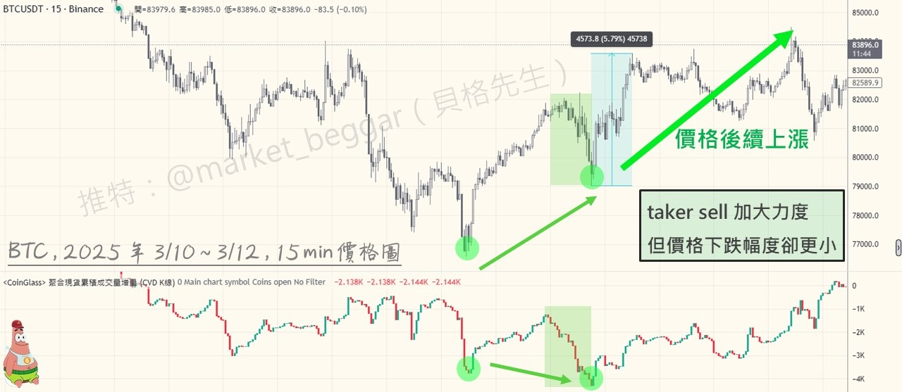 「taker sell 幾乎都被 maker buy 抵銷,因此即便 taker buy 不多(導致 CVD 為負),但也能驅動價格上漲。」