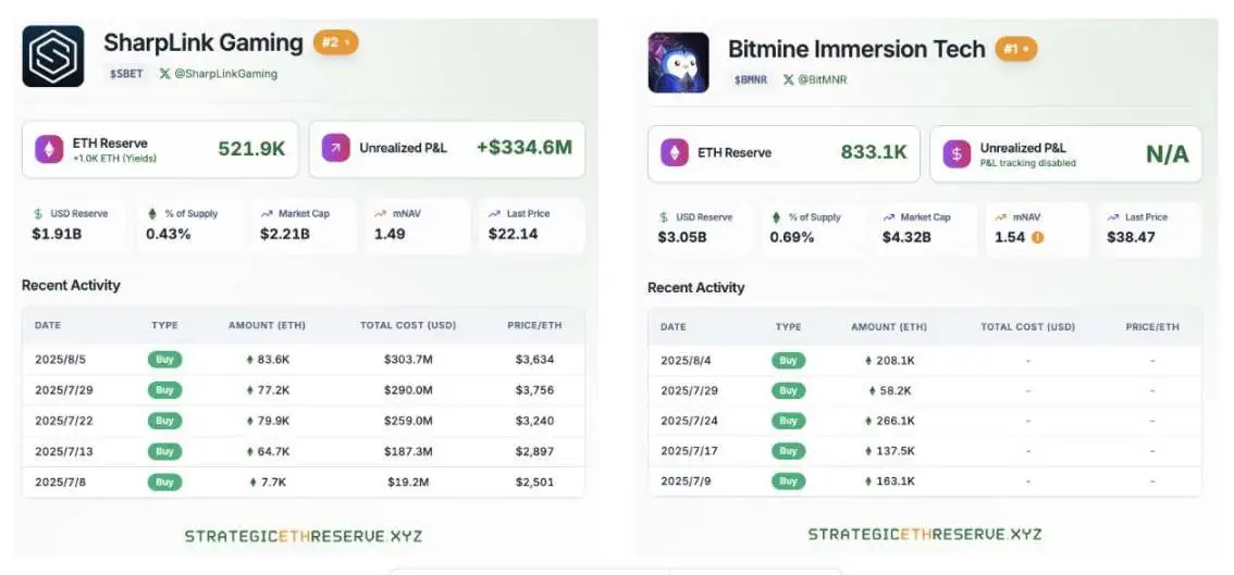 與此同時,以 BitMine 和 SharpLink 為首的 ETH 戰略儲備公司正在持續大批量購入 ETH,當前僅這兩家公司持有的 ETH 數量總和超過 135 萬枚 ETH。