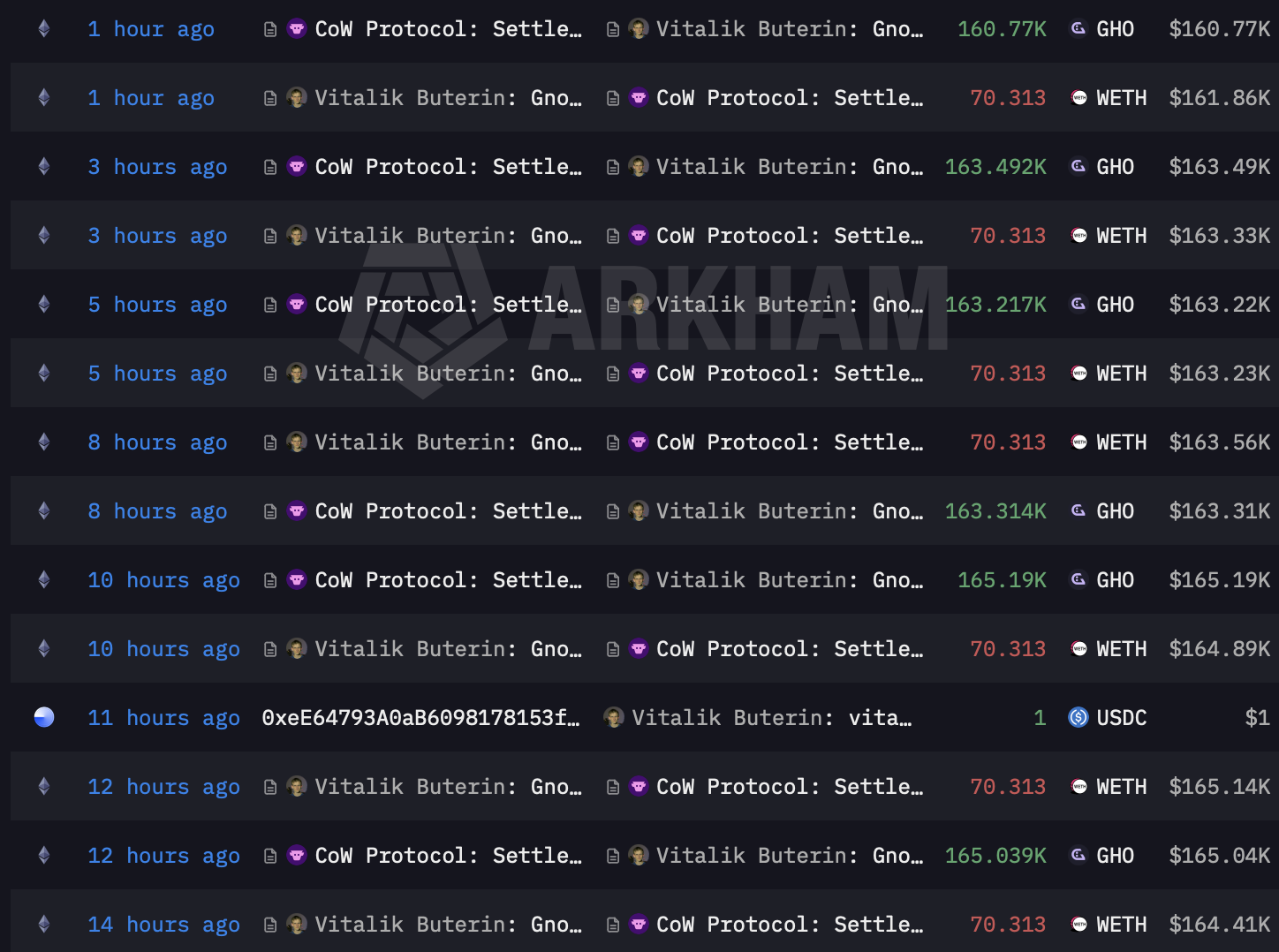 社群今日十分關注 Vitalik Buterin 將自己持倉的 ETH 賣出換成 GHO,根據 Arkham 紀錄,Vitalik 在過去 24 小時前將 5000 枚 ETH 換成 WETH,並陸續將 WETH 透過 Cow Protocol 換成 GHO,每次兌換 70 餘枚,過去 24 小時內已經換了 9 次,共換取約 144 萬美元的 GHO。