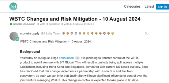 而關於社群所流出的關於 MakerDAO 發起了一項新提案,擬關閉 WBTC 借貸並將 Spark 的 WBTC 借貸比例降至 0 的消息同樣也是假消息。根據 MakerDAO 官網消息顯示,所謂「提案」僅為社群成員在社群發文討論,並無投票內容,更不代表官方態度。