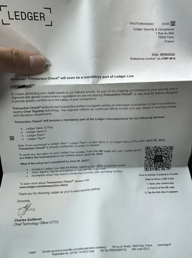 此外,還有部分使用者收到了快遞包裹,包裹裡的裝置外包裝甚至使用了收縮膜封裝。包裹中包含一臺偽造的 Ledger Nano X 錢包,以及帶有官方信頭的偽造信件,信中聲稱這是為了響應之前的資料洩露事件,為使用者更換 「更安全的新裝置」。