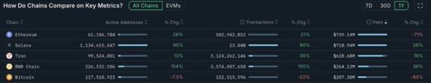 過去一年,如果只看公鏈的總交易費用收入,可以更清楚看到哪些鏈真正轉化出了使用價值。以太坊全年收入為 7.39 億美元,仍然是最主要的收入來源,但受到 Dencun 升級和 L2 分流影響,同比下降 71%。相比之下,Solana 年收入達 7.19 億美元,同比上漲 26%,在 Meme、AI Agent 熱潮的帶動下實現用戶活躍度和交互頻次的顯著提升。Tron 收入為 6.28 億美元,同比增長 18%。而比特幣全年收入為 2.07 億美元,主要受銘文交易熱度下滑影響,整體跌幅明顯。