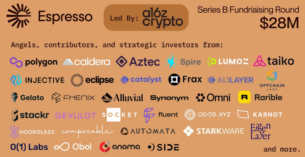 2024 年 3 月 21 號,Espresso Systems 公佈已完成由 A16zcrypto 領投的 2,800 萬美元 B 輪融資。 Espresso 指出,Polygon、Taiko、o1Labs、StarkWare、Offchain Labs 以及來自 30 多個生態系統專案的策略投資者加入了他們最近的 B 輪融資。