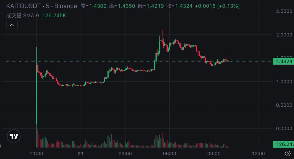 據幣安交易所數據,$KAITO 於台灣時間 2 月 20 日 21:00 正式上架幣安,震盪幾小時之後在今(21)日清晨更一度突破 2 美元,撰稿當下,幣價回落至 1.43 美元,整體表現還算不差。