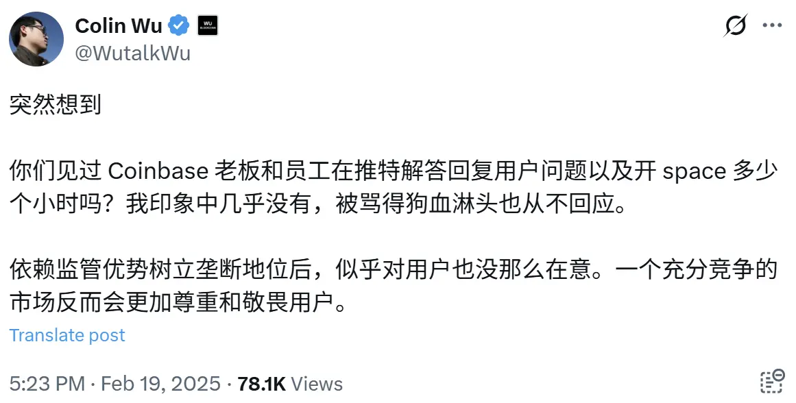 在使用者溝通方面,Coinbase 的存在感幾乎為零。它不面向散戶,也沒有建立起有效的使用者交流渠道。無論是 CEO 還是高管團隊,幾乎很少在社交平臺上公開回應使用者問題,哪怕在遭遇大量投訴和質疑時,也極少見其出面澄清或解釋。